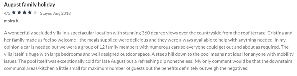 (The villa is not equipped to host guests on wheelchairs, there are 5 steps to enter in the villa, the bathrooms are not large enough for a wheelchair, the pool is not next to the villa) |