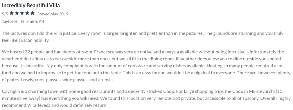 The Villa is located on the Chianti hills; the nearest town at only 1 km is Cavriglia. Cavriglia is a nice little town with pharmacy, grocery stores, coop, lovely churches, restaurants, theater and shops.