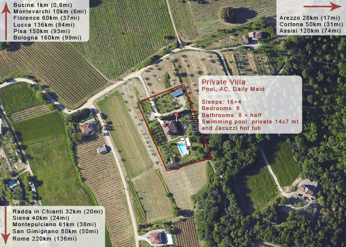 The villa is in the Chianti hills only 30/40 minutes far from Florence, Siena and Arezzo (by car or train).