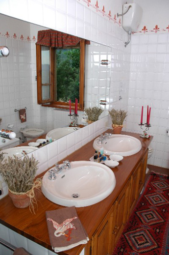 To the right of the sitting room with fireplace, a final door opens onto a short corridor with three doors that lead to a double bedroom, to a twin bedded room and to a complete bathroom with shower stall. The Villa is impeccably furnished with great care to details.