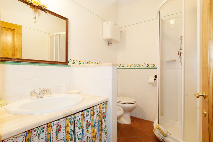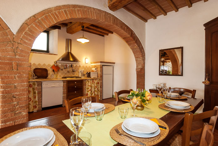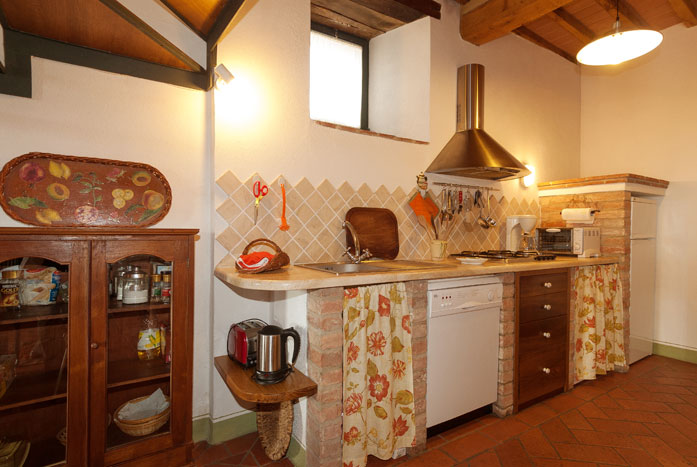 GROUND FLOOR: Entering the house from the terrace guests will find themselves in a wide room, which is divided in several areas: a sitting room with a big 16th century fireplace, a dining area and a kitchen equipped with refrigerator, dishwasher, washing machine and a little oven.