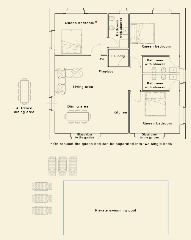 (on request 2 queen beds can be separated into 4 single beds, see the floorplan)