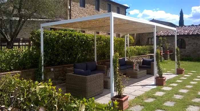 A gazebo is located near the swimming pool, and is equipped with chairs, tables for breakfast, lunch or dinner outside.