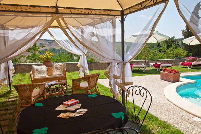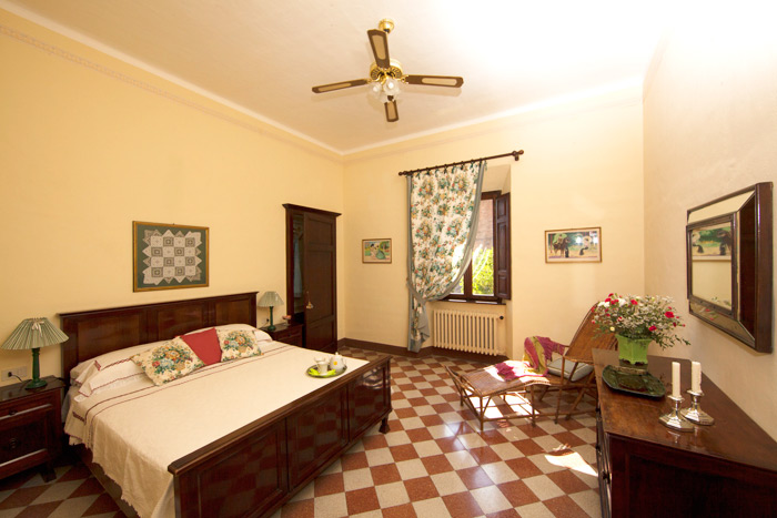 It is situated opposite the castle and has a large, sunny terrace and a wide garden, with a private swimming-pool, overlooking the spectacular Tuscan countryside.