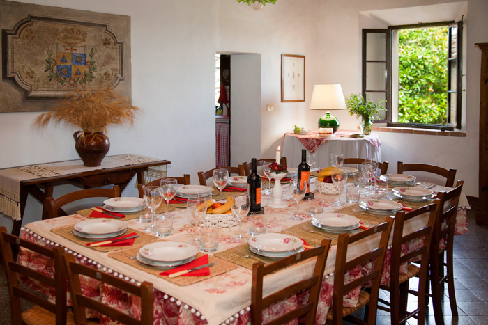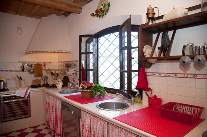 Ground floor: Entering the house from the terrace guests will find themselves in a wide room, which is divided in several areas: a sitting room with a big 16th century fireplace, a dining area and a kitchen equipped with refrigerator, dishwasher, washing machine and a little oven.